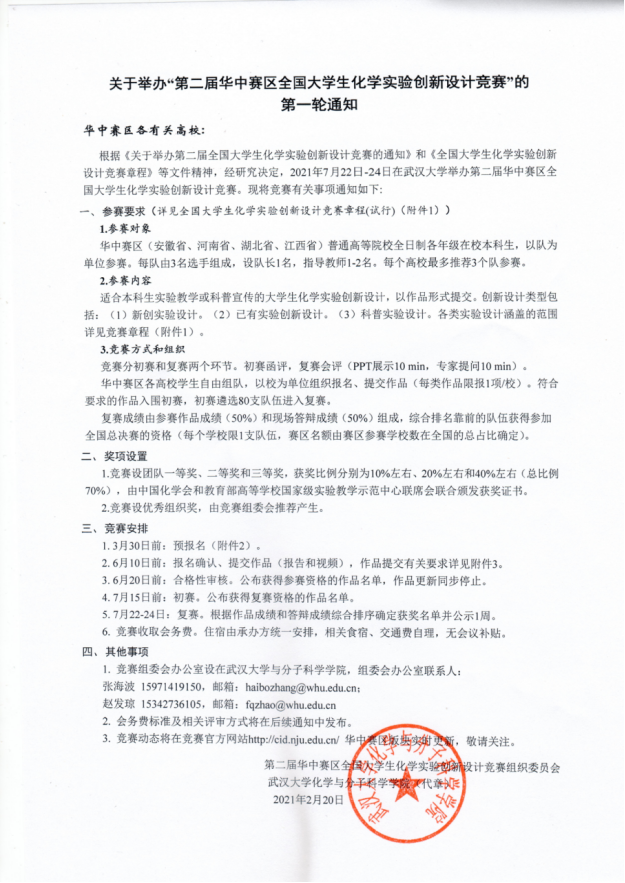 根据《关于举办第二届全国老员工化学实验创新设计竞赛的通知》和《全国老员工化学实验创新设计竞赛章程》等文件精神,第一届全国老员工化学实验创新设计竞赛组委会研究决定,2021年7月22日-24日在武汉大学举办第二届华中赛区全国老员工化学实验创新设计竞赛。竞赛由教学部高等院校化学类专业教学指导委员会主办,高等院校国家级实验教学示范中心联席会协办,青岛科技大学承办。现将竞赛的有关事项通知如下: