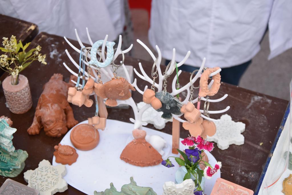 同学们利用工地上常见的废弃物如粉煤灰、矿粉、硅灰等原料,添加颜料、水泥等助剂,调配出浆体并且在模具中凝结成型,将固体废弃物变成了象棋、小狗、帆船等等饰品架上琳琅满目的工艺品,成功地实现了“变废为宝”。制作的手工艺品结合了矿物固体废弃物强度高、导热系数低和高分子材料颗粒密度小的特点,不仅质量轻同时又能隔热保温,同时促进工业固废的回收利用和环境保护。