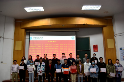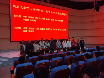 接下来进行的是2020-2021年度学业表彰。余江涛书记和汤鑫军老师给材料系和化学系前10名员工颁发奖状和奖品,合影留恋,并寄语同学们要戒骄戒躁、砥砺前行。