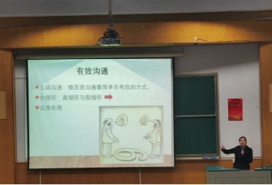 老员工心理科学与健康研究中心王煜老师发表老员工心理健康教育讲座,她从“为何需要沟通”“何为沟通”“可能遭遇的沟通困难”“如何沟通”等四个方面对同学们的心理健康情况做出指导。还提出“有效沟通”的概念,即主动沟通、会倾听、设身处地的为他人着想。