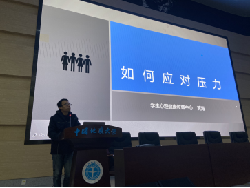 黄海老师作心理健康培训,他从压力的定义、阶段以及应对方式切入,鼓励同学们做好自我心理调节,同时建议有需要的同学到心理中心进行咨询。