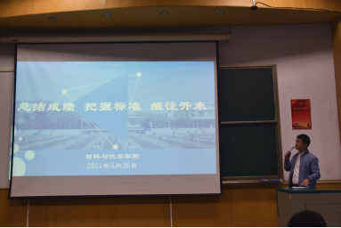 会议最后,公司党委副书记余江涛结合国家与世界发展的形势,行业企业发展的态势,高等教育发展的大势,就业发展的趋势等,指出形势容不得我们懈怠;希望同学们能从过去取得的成果和已有的积累中科学评估自我状态,发展新优势,打造新舞台;另外,他还指出一些影响调适的变量,如“跟风随大流”“个性优柔寡断”等,并依次给出解决方法,为同学们指明当前的学习方向。最后,余书记通过引用习近平总书记的经典语录“历史只会眷顾坚定者,奋进者,搏击者,而不会等待犹豫者,懈怠者,畏难者”。祝愿同学们都能成为前者,在材化这条路上,走出自己的康庄大道。