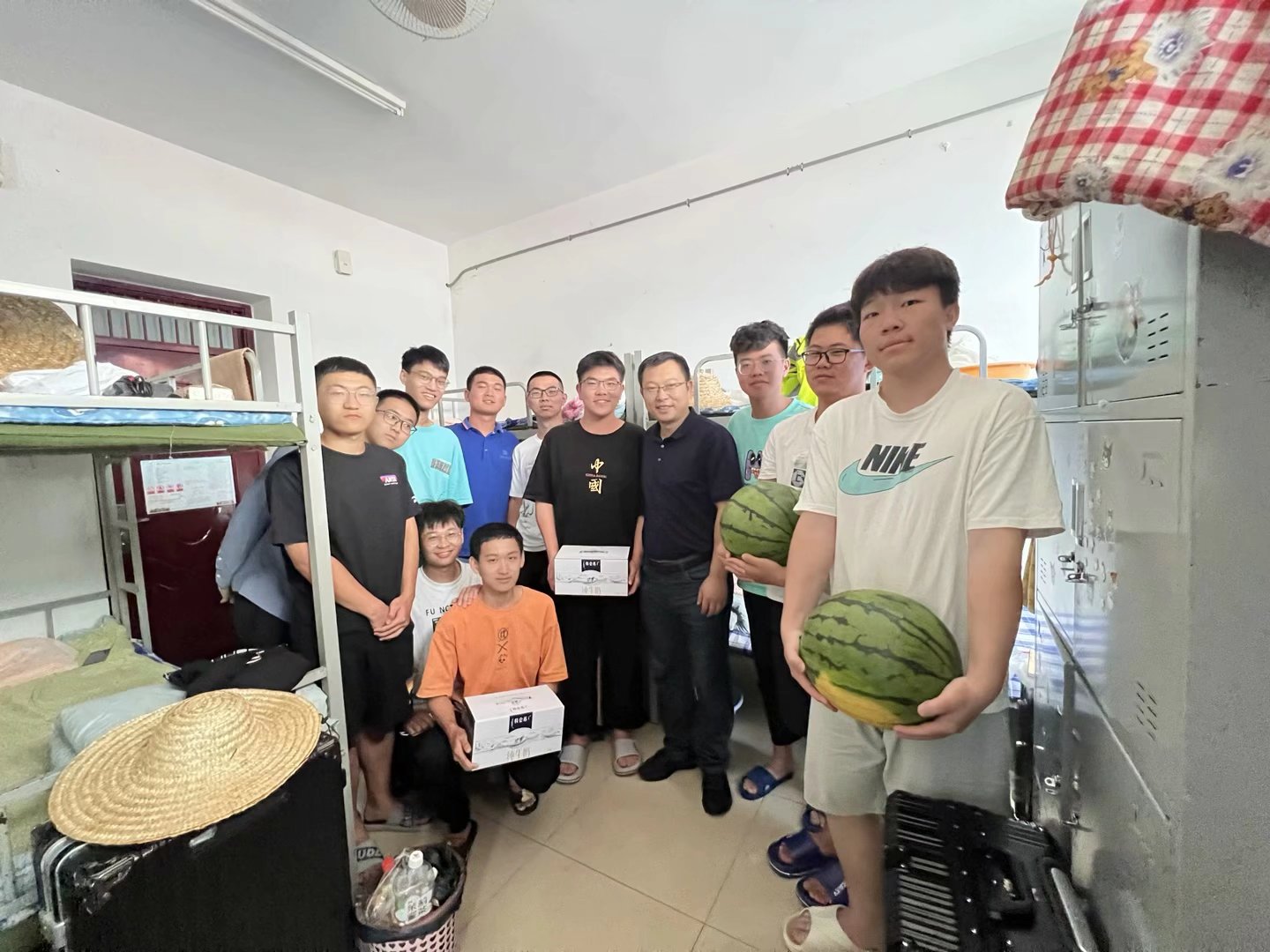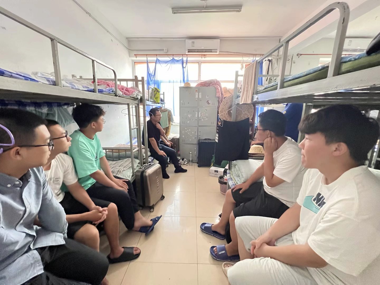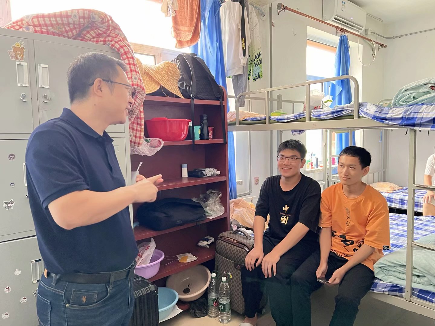 野外实习结束后,梁本哲书记来到实习基地员工宿舍与员工座谈并向同学们发放慰问物资。梁本哲坐在同学们的床铺上与同学们促膝长谈,向同学们亲切问候,并详细询问了在站学习、生活情况。