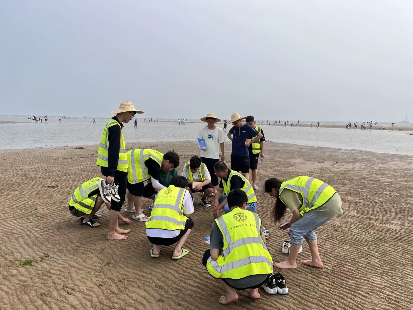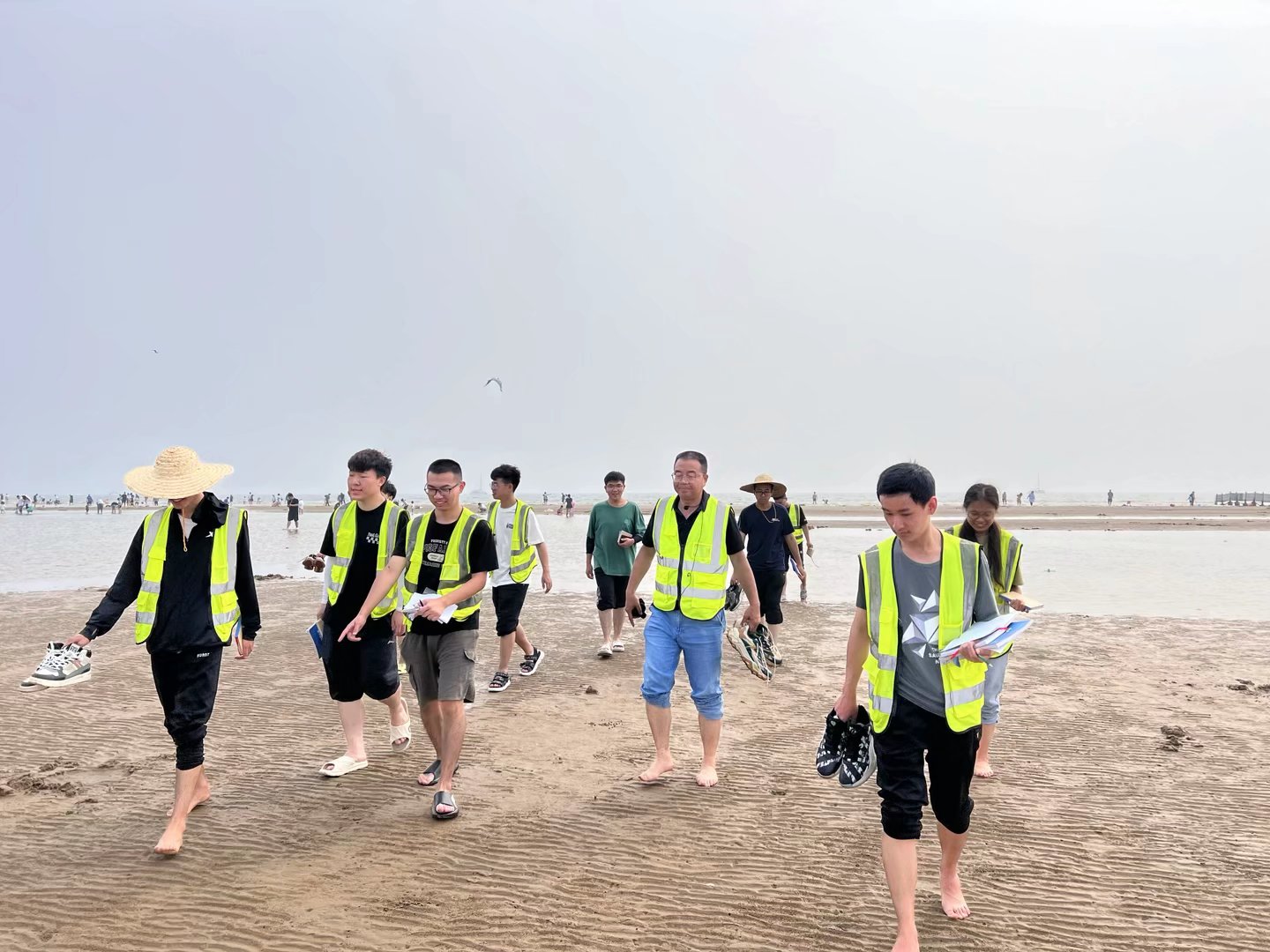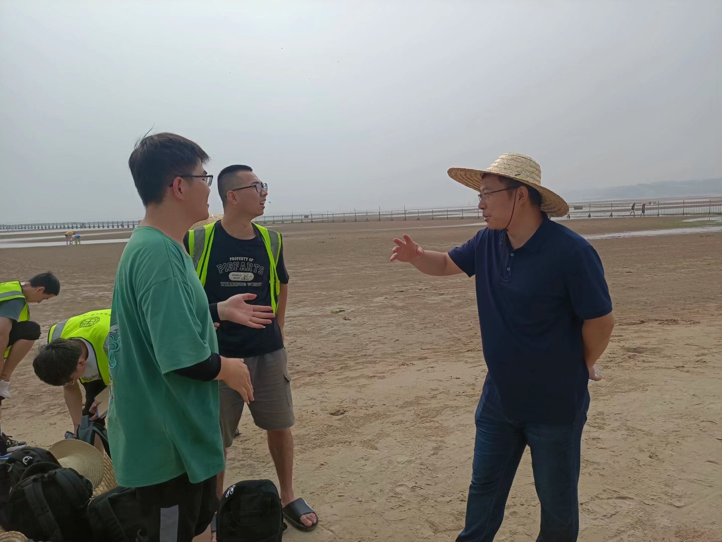 8月20日,梁本哲书记和实习师生一起同走新河口野外实习路线。带队专业教师葛文教授介绍本次实习安排以及整体进展,现场讲解新河口地质路线知识点。随后,梁本哲书记与实习师生共同观察泥沙质海岸沉积物特征、波浪运动特征与形态以及生物分布特征,并与实习师生交流相关实习问题,翻阅同学们的野外记录簿。