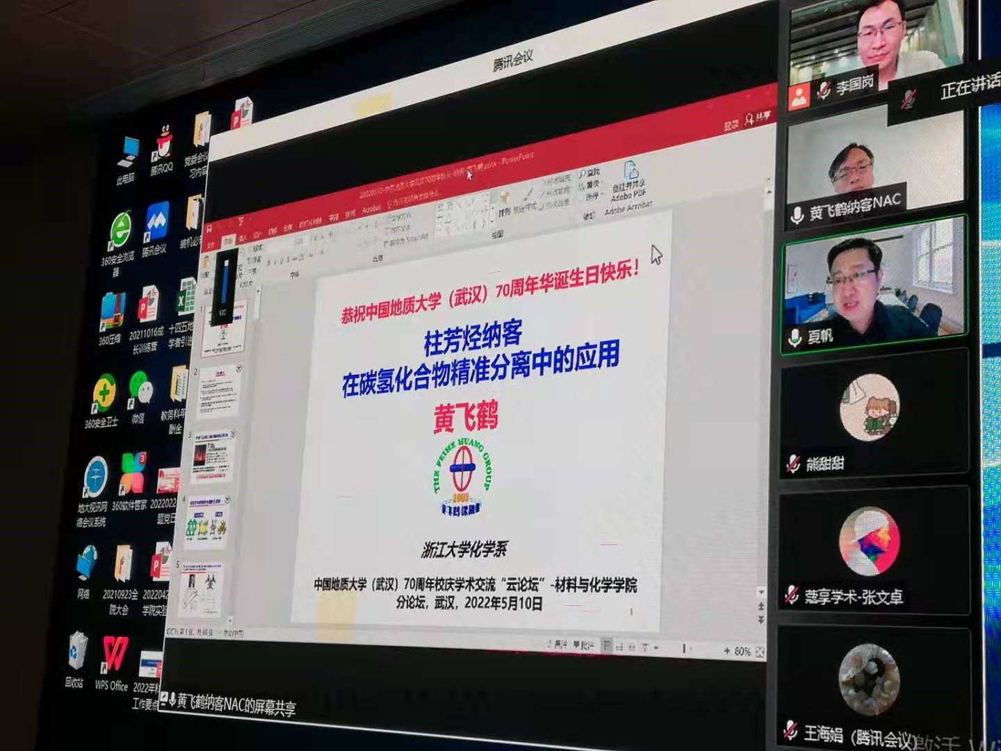 黄飞鹤教授首先在线做了题为“柱芳烃纳客在碳氢化合物精准分离中的应用”的学术报告。他指出:鉴于能源有限,开发合成简单、化学和热稳定性高、分离选择性高、重复使用性高的新型碳氢化合物分离材料迫在眉睫,而非多孔自适应晶体(Nonporous Adaptive Crystals,英文简称为“NACs”,中文简称为“纳客”)为我们提供了很好的选择。他还逐一展示了柱芳烃纳客在苯乙烯/乙基苯分离、对二甲苯纯化、1-戊烯/2-戊烯分离、甲基环己烷/甲苯分离、碘吸附等方面的应用。