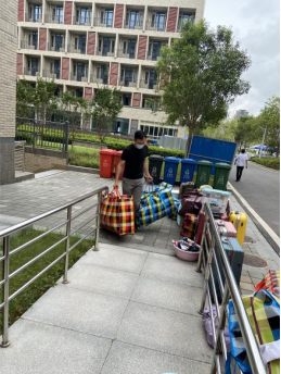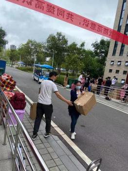 在终点站——未来城校区,公司领导班子和院直老师早早就在宿舍楼下等待同学们的到来,让同学们一下车就感受到了亲人般的关怀。未来城校区管理办也为同学们安排了充足的行李转运车。从大巴车到转运车,从宿舍楼下到宿舍,公司领导老师和同学们齐心协力,将全部行李妥帖地搬到各自宿舍。