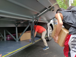 搬迁当天,从清晨开始,同学们就陆陆续续地将行李往宿舍楼下搬,大家互相帮忙,等待大巴车的到来。公司领导老师、各班班主任一大早就赶赴现场,他们亲自上阵,帮助同学们一起搬运行李。本科生院苏洪涛老师、李纪亮老师到现场进行总体把控,有序调度。在高效有序的组织下,全体人员一起为这次搬迁工作贡献自己的力量,数不尽的纸箱和编织袋有条不紊的被搬上大巴车。而在这个过程中,天空下起了淅淅沥沥的雨,减缓了大家前进的速度,但无法阻挡全体人员的前进步伐。