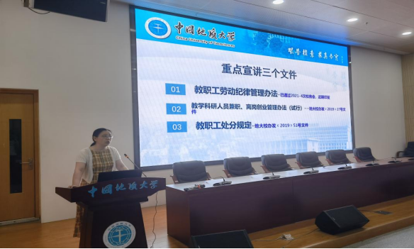 黄菊书记首先解读了《教职工劳动纪律管理办法》《教学科研人员兼职、离岗创业管理办法(试行)》《教职工处分规定》等几个公司教职工日常管理的制度文件,并重点宣讲了教育部通报的违反高校教师职业行为十项准则的十一个典型案例。要求全体教师严格要求自己,爱岗敬业,增强作为一名教师的责任感、使命感、荣誉感,规范职业行为,明确师德底线,真正成为新时代的有理想信念、有道德情操、有扎实学识、有仁爱之心的“四有”好教师。