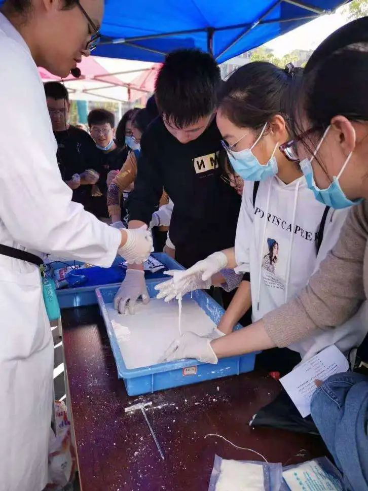 一旁“晶美绝伦”的现场,展演队员一反日常生活中热胀冷缩的常识,指导观众在热缩片绘制自己喜欢的图案,裁剪成型后利用热风枪按压热缩片进行热缩,只见大图案瞬间在热风枪下缩小数倍,在其表面覆盖紫外固化胶后,一份具有创意性的小工艺品就做成了