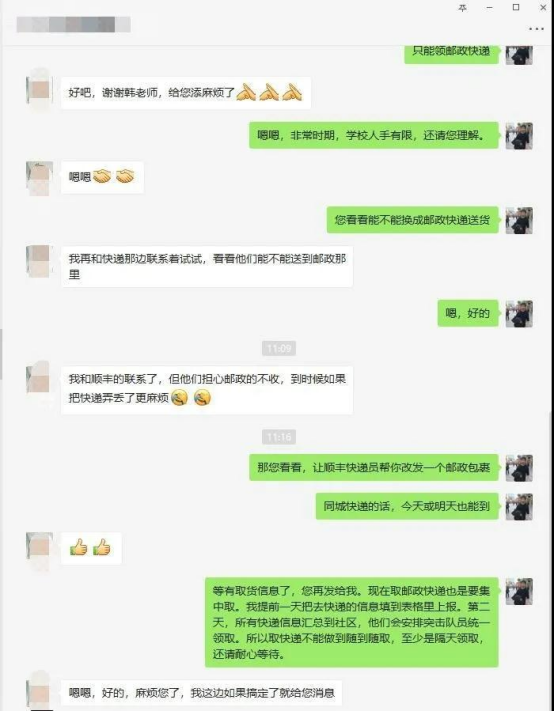 可偶尔还是会有一些突发情况。有一次,一名住户在网上购买了急需的药品,住户自己跑到大门口去取。但按照公司疫情期间的管理规定,快递不能进入公司。眼看着药品放在大门口却无法取回,这名住户心急如焚,于是他给韩波打电话。韩波接起电话,电话里住户情绪激动,劈头盖脸就是一顿质问,表示对公司的做法不能理解。“您先消消气,对快递的管控是公司从防疫全局考虑作出的安排,如果每个人还像平时那样去取快递,会大大增加感染的风险。这样吧,如果您相信我的话就把这件事交给我,我来想办法解决。”考虑到住户购买的是急需药品,韩波先联系社区的应急突击队,请求从中协调安排人员帮忙领取快递。当突击队员将药品送到住户家里时,他给韩波发了一条真诚的微信:“小韩老师,药品收到,感谢你的帮助。当时情急,一时口不择言,还请你见谅。”