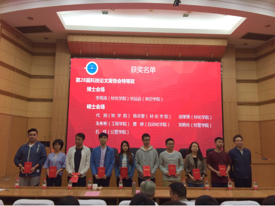 大会针对在各类研究生创新实践类赛事上斩获佳绩的个人和团体代表进行了表彰。公司2017级博士生李海涛、2015级硕士生胡策策以及2016级硕士生陈志雯在第二十八届研究生科技论文报告会上表现突出,分别在博士会场和硕士会场拔得头筹,荣获“特等奖”,作为研究生代表获得表彰。