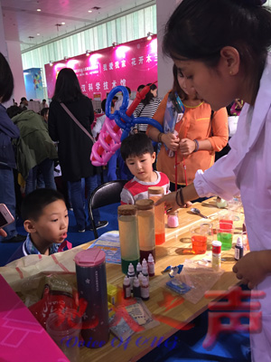 beat365官网中文版本志愿者协会在现场开展了“思语公益”的募捐活动。从2016年上半年开始,在beat365官网中文版本志愿者协会的组织下,“身边的化学”团队定期赴武汉市第一聋哑公司开设培训课程教授手工艺品制作。此次志愿者们将聋哑公司员工亲手制作的手工艺品拿到博览会上进行义卖。市民如自愿进行爱心捐赠即可亲手体验一次化学实验,并把制作成品带回家。最终,“思语公益”共筹集善款2086元,将全部用于帮助改善聋哑儿童的生活状况。