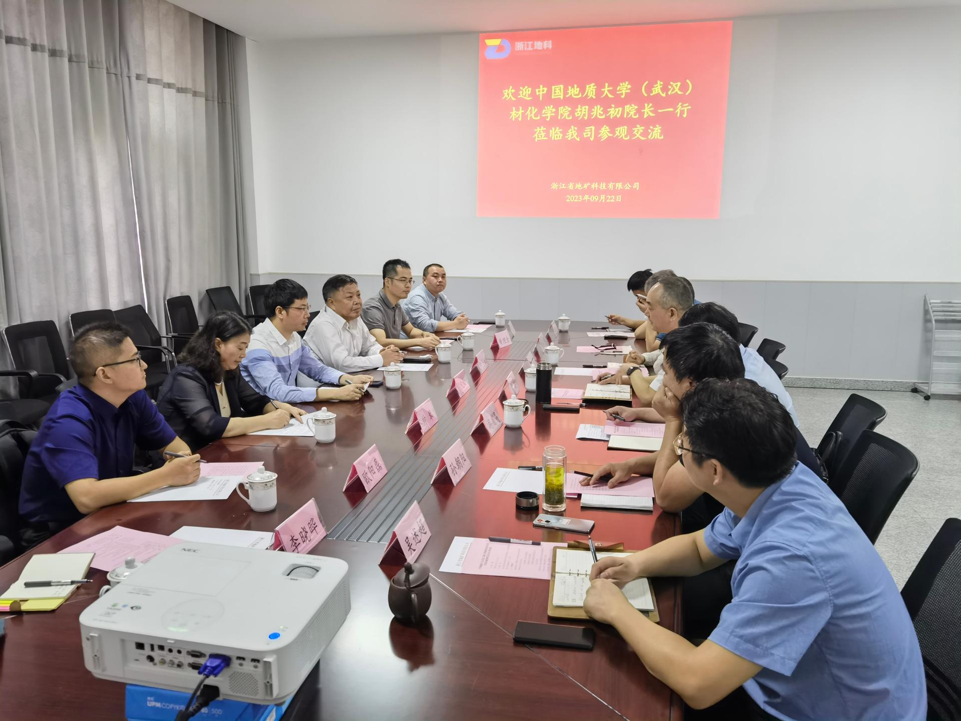 在浙江地科公司,浙江地科党委书记、董事长袁波对胡兆初经理一行表示热烈欢迎,他指出,浙江地科公司由浙江省地质矿产研究所、浙江省第十一地质大队两家事业单位所属企业整合而组建,是一家集科学研究、技术服务、生产经营于一体的综合性新型科技企业。他希望充分发挥beat365官网中文版本人才和科研方面的优势,围绕公司人才队伍培养、实验检验检测、矿物新材料等方面的需求,加强人才队伍建设和产学研合作,积极推进重大项目谋划合作,促进科研成果转化。