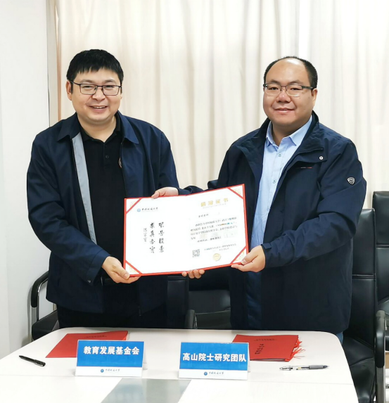 2022年10月7日,捐赠仪式在员工与社会合作处举行,公司教育发展基金会秘书长陈华荣与高山院士研究团队代表李明老师签署捐赠协议。